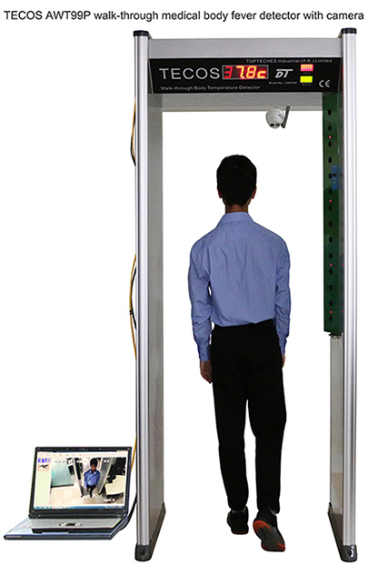 TECOS AWT99P walk-through body temperature detector has a high sensitive detection temperature, detects a wide range and fast speed and doesn't interfere with the measured target, its use is safe. Only when people pass through it in the detection body range, this instrument can show immediate human body surface temperatures, the operator can obtain accurate data, if they are suspicious fever patients, it will immediately report to the police apparatus, thus is a timely and effective manner to prevent spread and infection of virus and flu flow. AWT99P detector is a human fever screening detector.